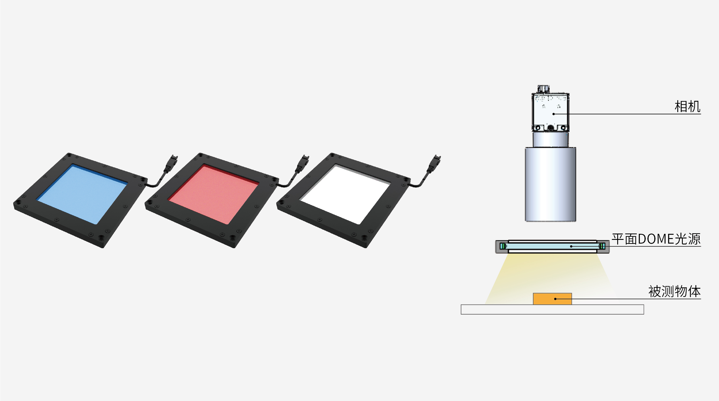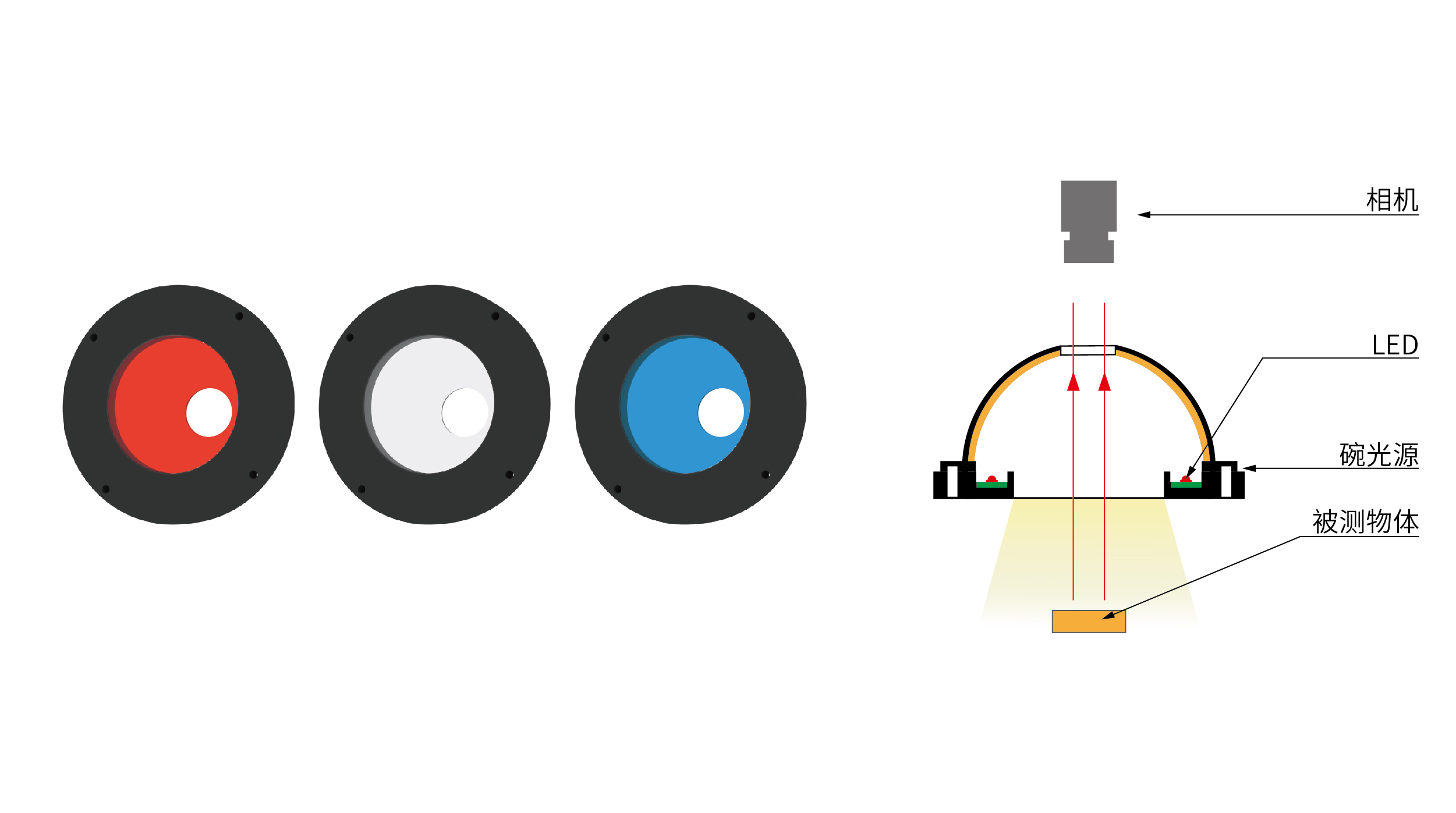 LED向圆顶照射,球形圆顶各个角度反射光线倒产品上,因此可以获得无阴影,均匀的效果