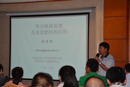 华南农业大学张承林教授围绕“土壤”和“肥料”两大板块透彻分析讲解了养分吸收原理及水溶肥料的应用。在南方柑桔园的主要土壤问题上,张教授介绍说,通气差、酸化、缺少有机质、养分不平衡,是普遍面临的问题,通过水肥一体化技术,科学施肥,合理用量,是解决此类问题的核心要点。张教授表示液体肥料具有诸多优点,将成为未来肥料市场的主流肥料,并强调水肥一定要结合使用,所有灌溉设施如果不结合施肥,等于浪费了一半的设备功能。张教授用2个小时的时间,以通俗易懂的方式,深入浅出地讲解作物养分吸收、病害防治、土壤酸碱化盐害的判断和处理、水溶肥应用等问题。课程结束后,张教授对嘉宾们提出的柑桔黄化问题及其原因等进行了回答和分析。