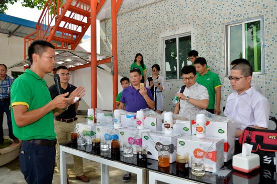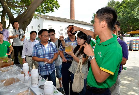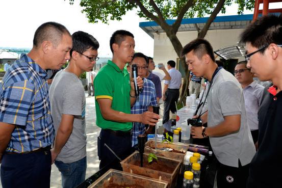 与会人员参观乡喜液体肥料产品水溶性和含水量的演示