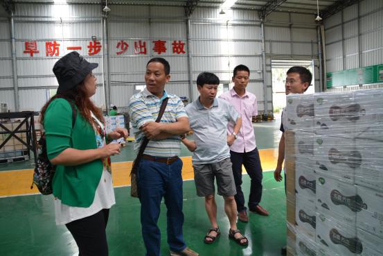 林明董事长(左3)参观乡喜液体肥使用的包材——纸箱+液袋