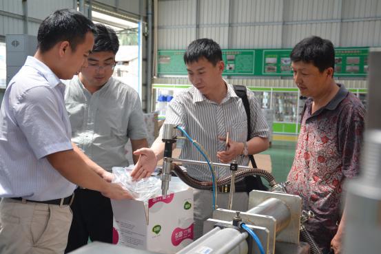 王厂长(图左1)一行参观液体肥料半自动分装线