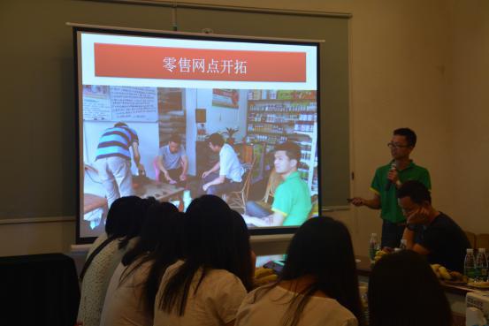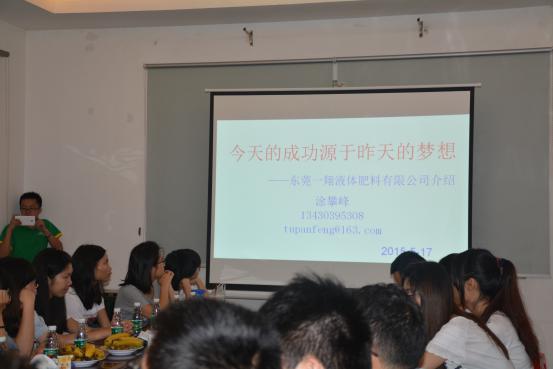 随后,我司大区经理蓝奕斌以“那些我们在一翔干过的事”为主题,通过一张图片讲述一个故事的形式,形象生动地诠释了业务员在前线所做的工作。期间穿插了工作人员使用简易施肥设备施肥的视频,学生们对公司在施肥设备方面的创新都赞叹不已。