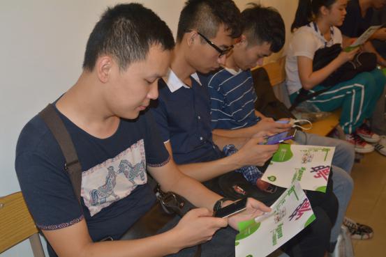 学生们阅读宣传单张并扫描二维码关注乡喜液体肥公众号