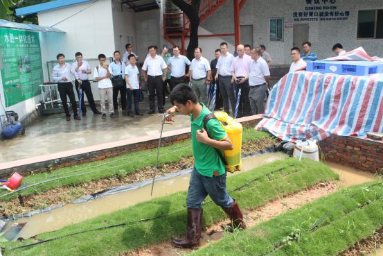 中化化肥考察团先后参观了公司生产分装车间,水肥一体化技术展示区和质检中心,并就液体肥料的生产工艺、配送运输以及产品包装线等环节进行了交流。在模拟田间试验区,考察团实地观看了技术人员如何将液体肥料与各种灌溉施肥设备完美结合,实现水肥一体化。