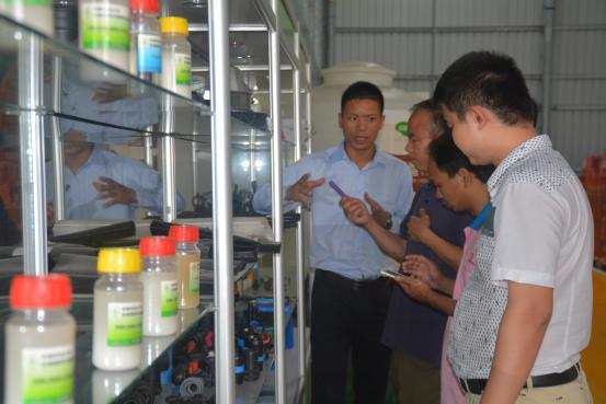 罗教授参观了公司的质检中心、生产分装车间和水肥一体化技术展示区,并就质检研发管理系统的形成、液体肥料的生产工艺、成品的包装流程及运作管理进行交流。在水肥一体化技术展示区,罗教授一行参观了解了多种简易施肥设备和灌溉系统的操作原理和操作方法。参观结束后,罗教授一行应邀到一楼会客厅交流更多农业企业管理知识。