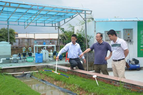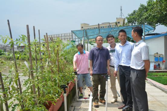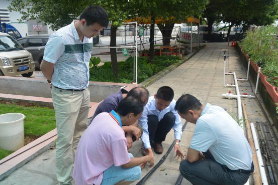 罗教授(图右2)一行了解灌溉首部系统的结构及其运作原理