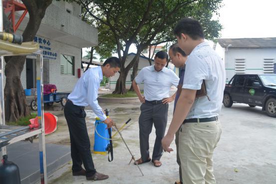 罗教授(图右2)一行参观施肥枪、双管施肥器、水瓢施肥器等多种简易施肥设备